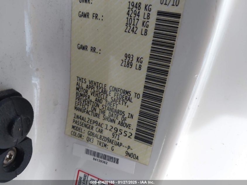 Color WhiteCylinders 4Drive Front wheel driveVIN 1N4AL2EP9AC******State Run & Drive VerifiedDamage All over the car AutoRIA