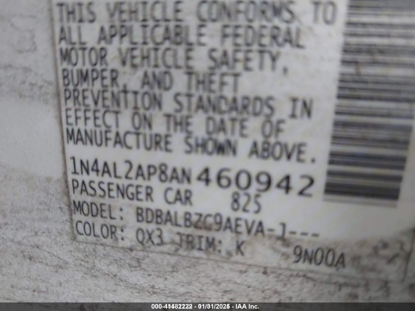 Color WhiteCylinders 4Drive Front wheel driveVIN 1N4AL2AP8AN******State Run & Drive VerifiedDamage Front right AutoRIA