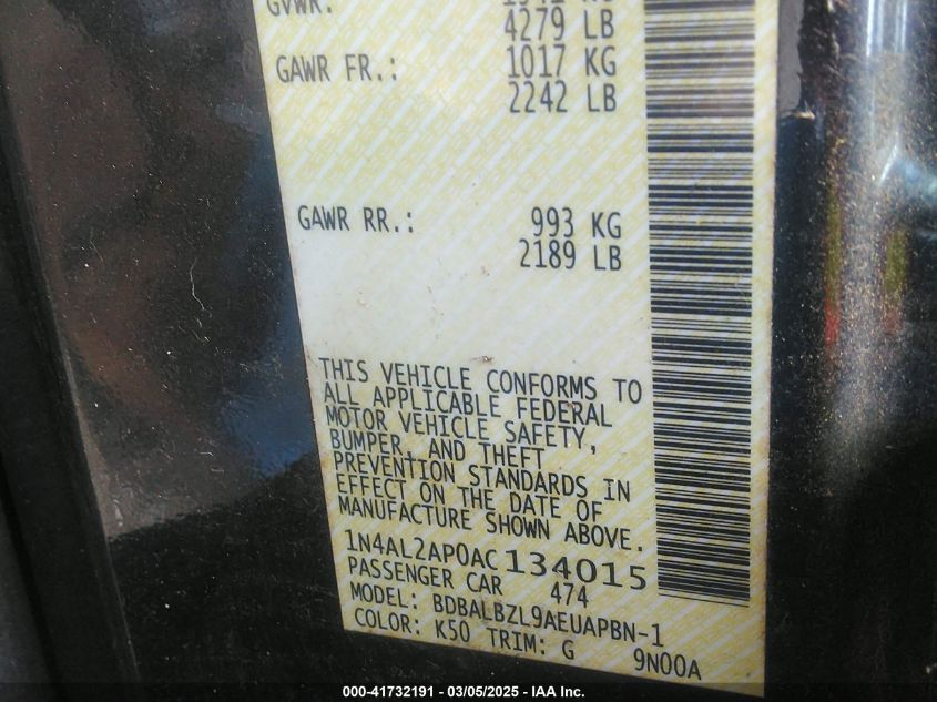 Color GrayCylinders 4Drive Front wheel driveVIN 1N4AL2AP0AC******State Run & Drive VerifiedDamage Front or backAuction date 2025-03-25 AutoRIA