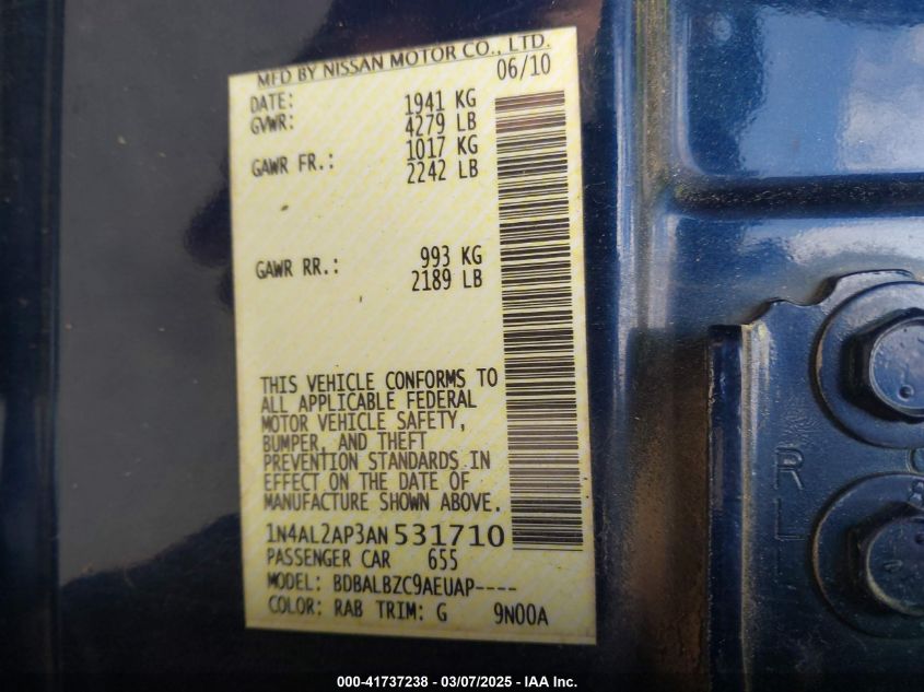 2010 NISSAN ALTIMA 2010 Gasoline, 2.5, Front wheel drive, VIN - 1N4AL2AP3AN****** from the USA
