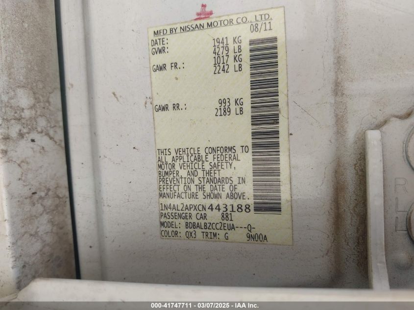 2012 NISSAN ALTIMA 2012 Gasoline, 2.5, Front wheel drive, VIN - 1N4AL2APXCN****** from the USA