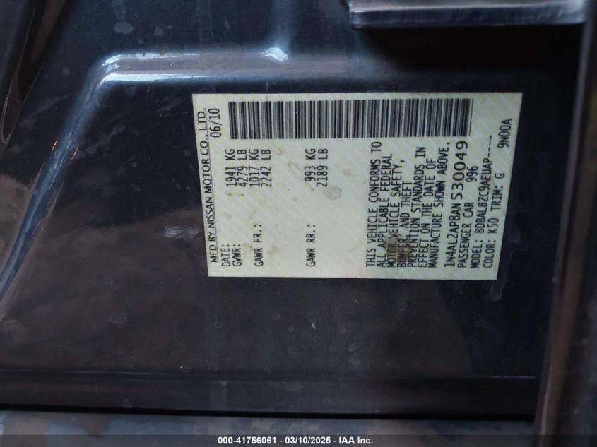2010 NISSAN ALTIMA 2010 Gasoline, 2.5, Front wheel drive, VIN - 1N4AL2AP8AN****** from the USA