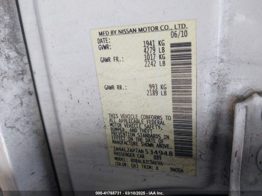 2010 NISSAN ALTIMA 2010 Gasoline, 2.5, Front wheel drive, VIN - 1N4AL2AP7AN****** from the USA