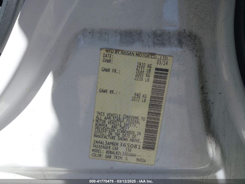 Color WhiteCylinders 4Drive Front wheel driveVIN 1N4AL3AP6EN******State Run & Drive VerifiedDamage Front or back AutoRIA