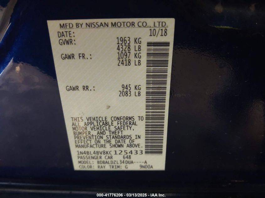 Color BlueCylinders 4Drive Front wheel driveVIN 1N4BL4BV8KC******State Run & Drive VerifiedDamage Back AutoRIA