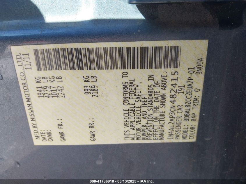 Color BlueCylinders 4Drive Front wheel driveVIN 1N4AL2AP3CN******State Run & Drive VerifiedDamage Back AutoRIA