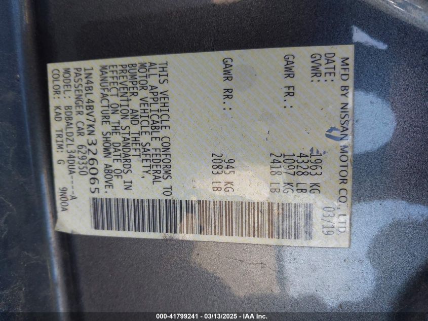 Color GrayCylinders 4Drive Front wheel driveVIN 1N4BL4BV7KN******State Run & Drive VerifiedDamage Front or back AutoRIA