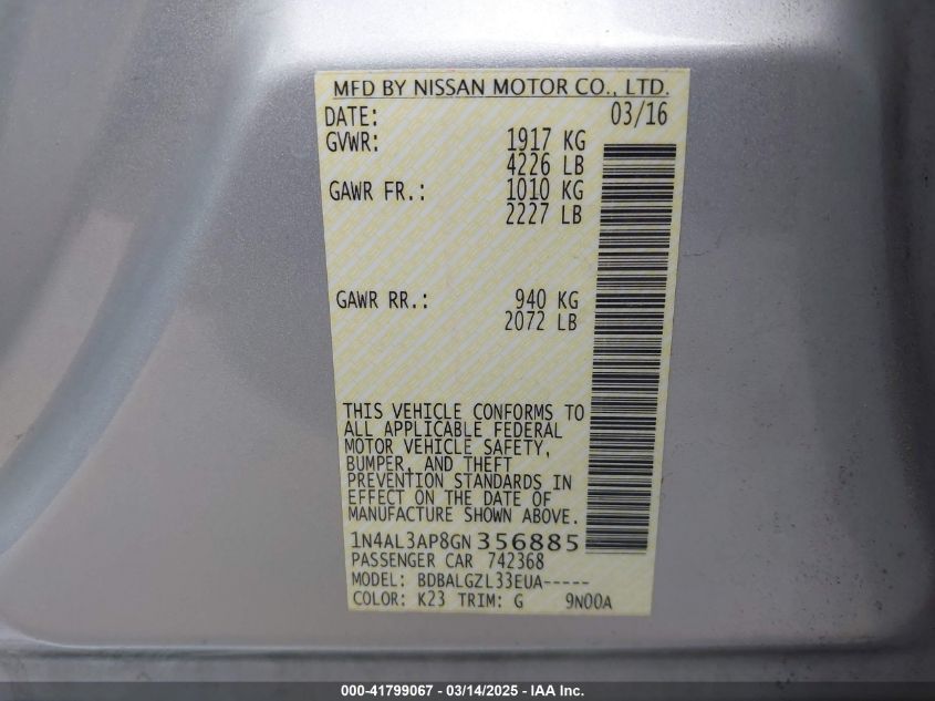 2016 NISSAN ALTIMA 2016 Gasoline, 2.5, Front wheel drive, VIN - 1N4AL3AP8GN****** from the USA