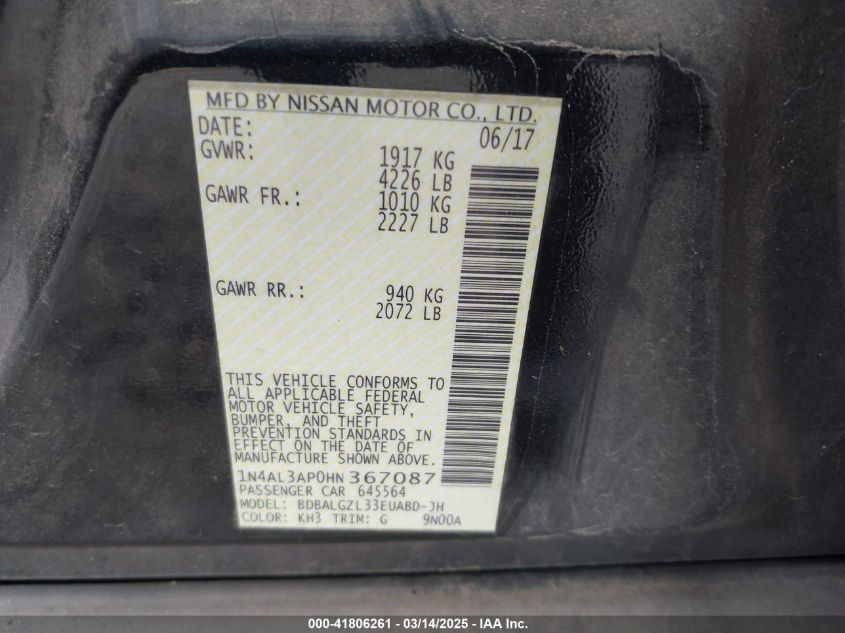 Color BlackCylinders 4Drive Front wheel driveVIN 1N4AL3AP0HN******State Run & Drive VerifiedDamage Front and back AutoRIA
