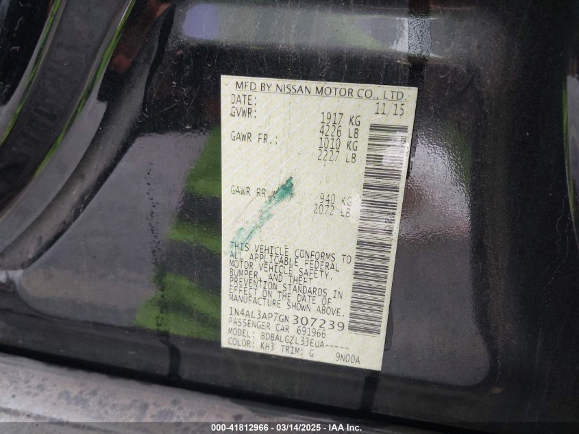 Color BlackCylinders 4Drive Front wheel driveVIN 1N4AL3AP7GN******State Run & Drive VerifiedDamage Back AutoRIA