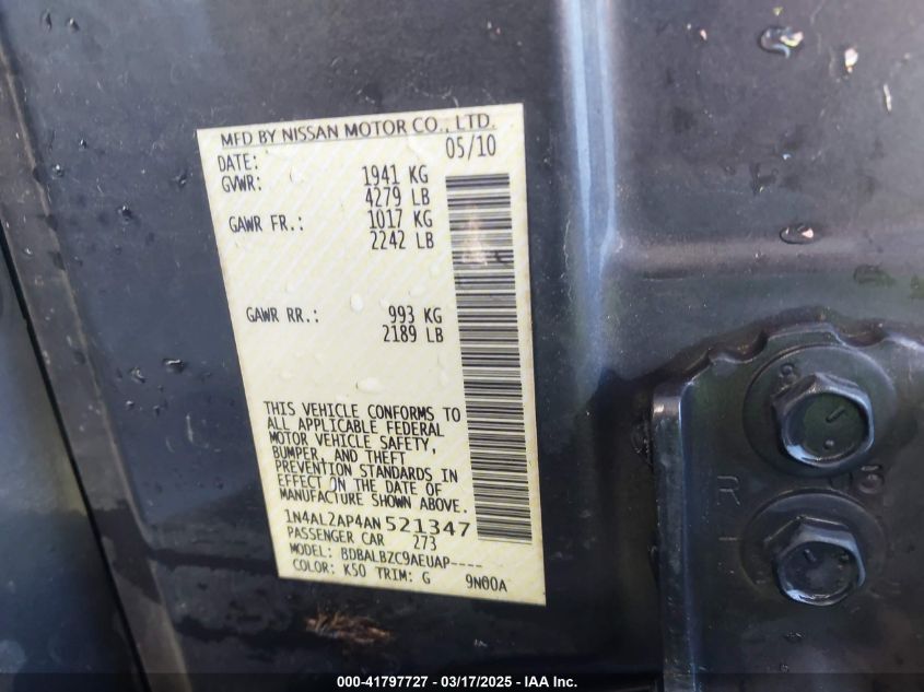 2010 NISSAN ALTIMA 2010 Gasoline, 2.5, Front wheel drive, VIN - 1N4AL2AP4AN****** from the USA
