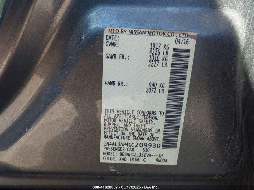 2016 NISSAN ALTIMA 2016 Gasoline, 2.5, Front wheel drive, VIN - 1N4AL3AP4GC****** from the USA