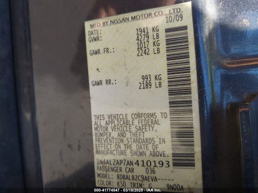 2010 NISSAN ALTIMA 2010 Gasoline, 2.5, Front wheel drive, VIN - 1N4AL2AP7AN****** from the USA