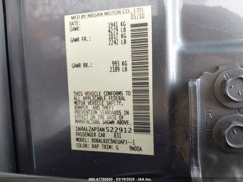 2010 NISSAN ALTIMA 2010 Gasoline, 2.5, Front wheel drive, VIN - 1N4AL2AP3AN****** from the USA