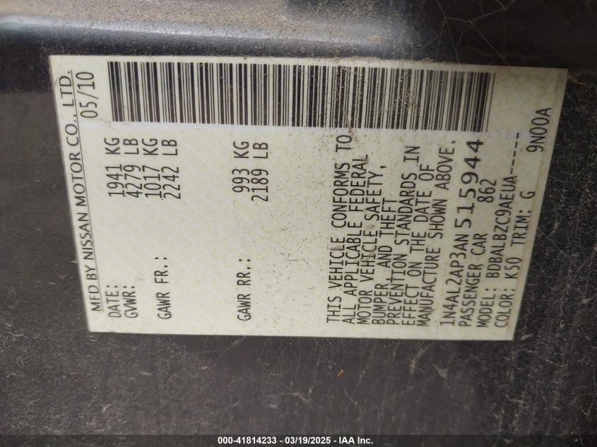 2010 NISSAN ALTIMA 2010 Gasoline, 2.5, Front wheel drive, VIN - 1N4AL2AP3AN****** from the USA