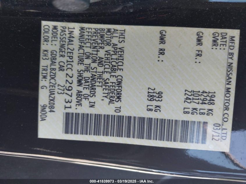 Color BlackCylinders 4Drive Front wheel driveVIN 1N4AL2EP1CC******State Run & Drive VerifiedDamage Front or back AutoRIA