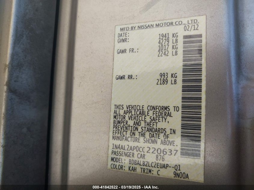 Color GrayCylinders 4Drive Front wheel driveVIN 1N4AL2AP0CC******State Run & Drive VerifiedDamage From the sides AutoRIA