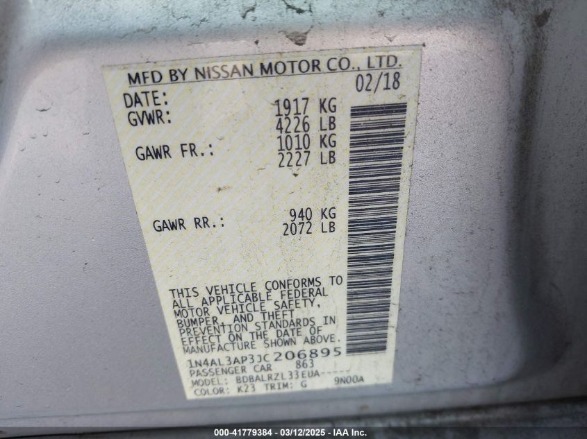 2018 NISSAN ALTIMA 2018 Gasoline, 2.5, Front wheel drive, VIN - 1N4AL3AP3JC****** from the USA