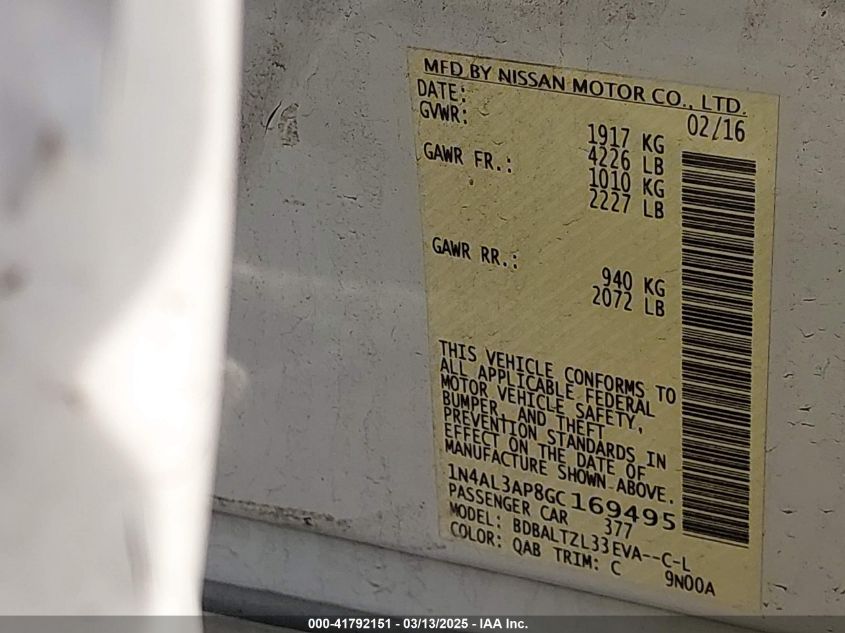 Color WhiteCylinders 4Drive Front wheel driveVIN 1N4AL3AP8GC******State Run & Drive VerifiedDamage Left side AutoRIA