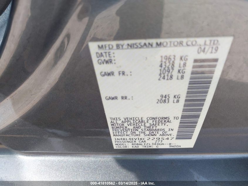 2019 NISSAN ALTIMA 2019 Gasoline, 2.5, Front wheel drive, VIN - 1N4BL4EV1KC****** from the USA