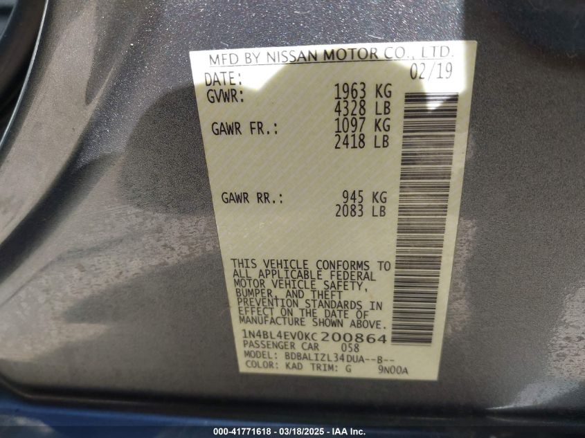 2019 NISSAN ALTIMA 2019 Gasoline, 2.5, Front wheel drive, VIN - 1N4BL4EV0KC****** from the USA