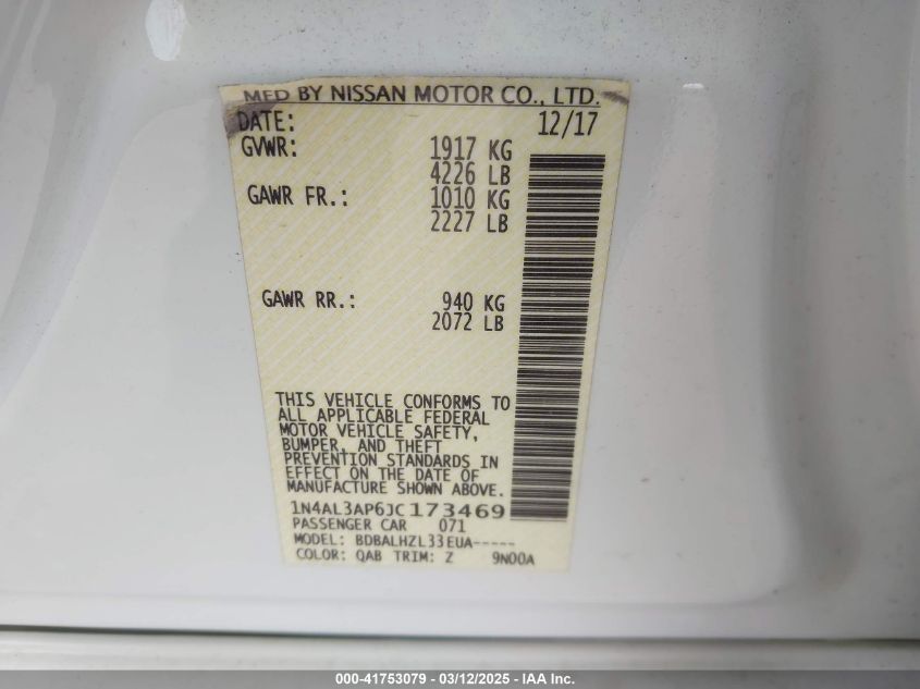Color WhiteCylinders 4Drive Front wheel driveVIN 1N4AL3AP6JC******State Run & Drive VerifiedDamage Back AutoRIA