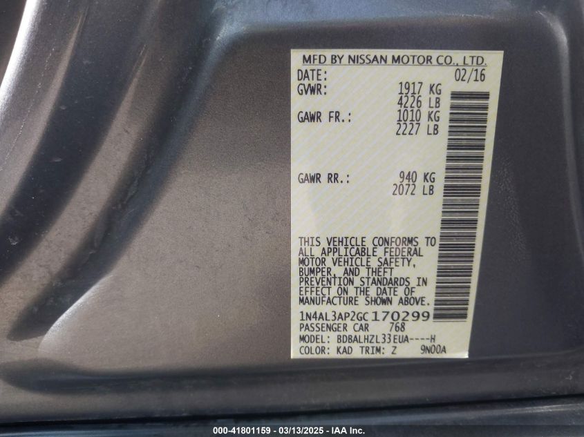 2016 NISSAN ALTIMA 2016 Gasoline, 2.5, Front wheel drive, VIN - 1N4AL3AP2GC****** from the USA