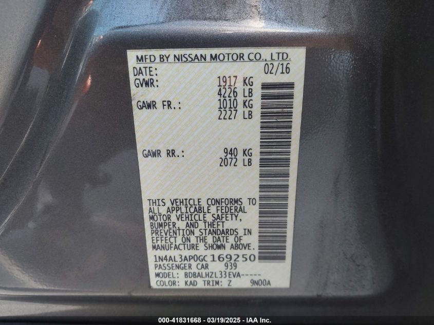 Color GrayCylinders 4Drive Front wheel driveVIN 1N4AL3AP0GC******State Run & Drive VerifiedDamage Front or back AutoRIA