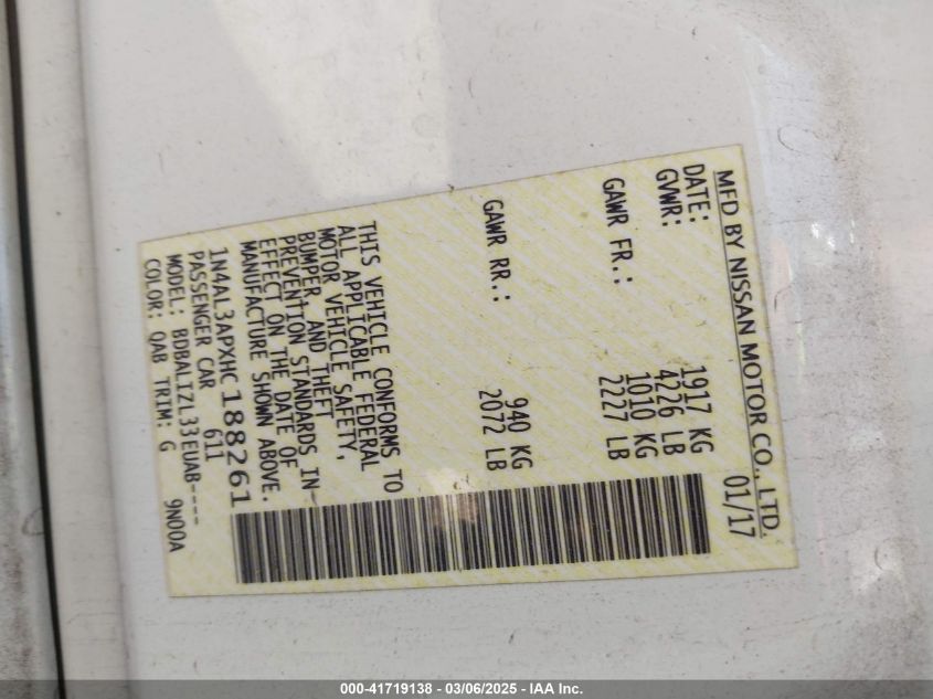 Color WhiteCylinders 4Drive Front wheel driveVIN 1N4AL3APXHC******State Run & Drive VerifiedDamage Back AutoRIA
