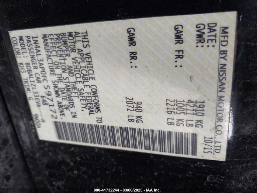 Color BlackCylinders 4Drive Front wheel driveVIN 1N4AL3AP0FC******State Run & Drive VerifiedDamage BackAuction date 2025-03-21 AutoRIA