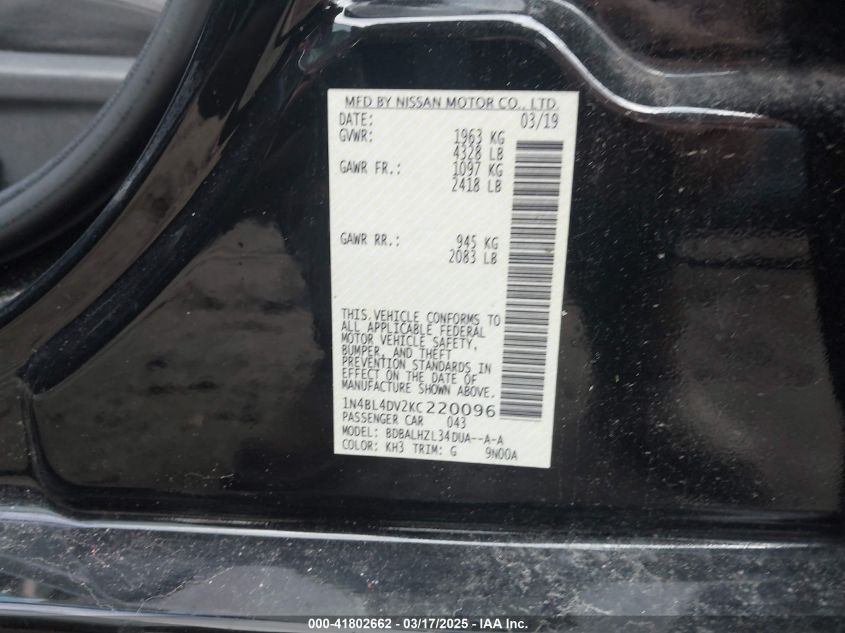 2019 NISSAN ALTIMA 2019 Gasoline, 2.5, Front wheel drive, VIN - 1N4BL4DV2KC****** from the USA