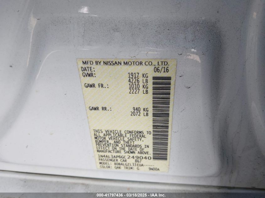 Color WhiteCylinders 4Drive Front wheel driveVIN 1N4AL3AP6GC******State Run & Drive VerifiedDamage Front or back AutoRIA