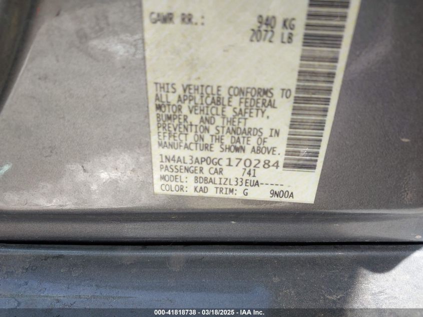 Color GrayCylinders 4Drive Front wheel driveVIN 1N4AL3AP0GC******State Run & Drive VerifiedDamage Right side AutoRIA