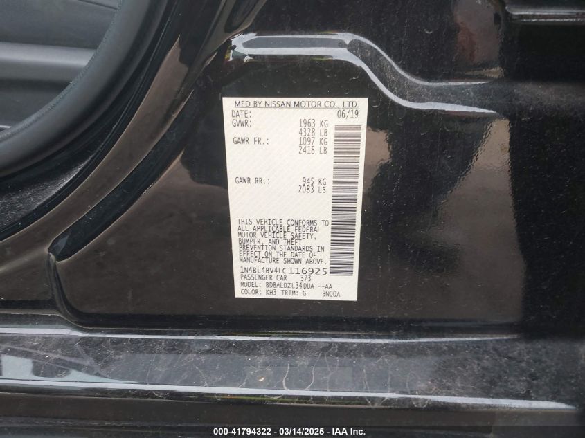 Color BlackCylinders 4Drive Front wheel driveVIN 1N4BL4BV4LC******State Run & Drive VerifiedDamage Front or back AutoRIA