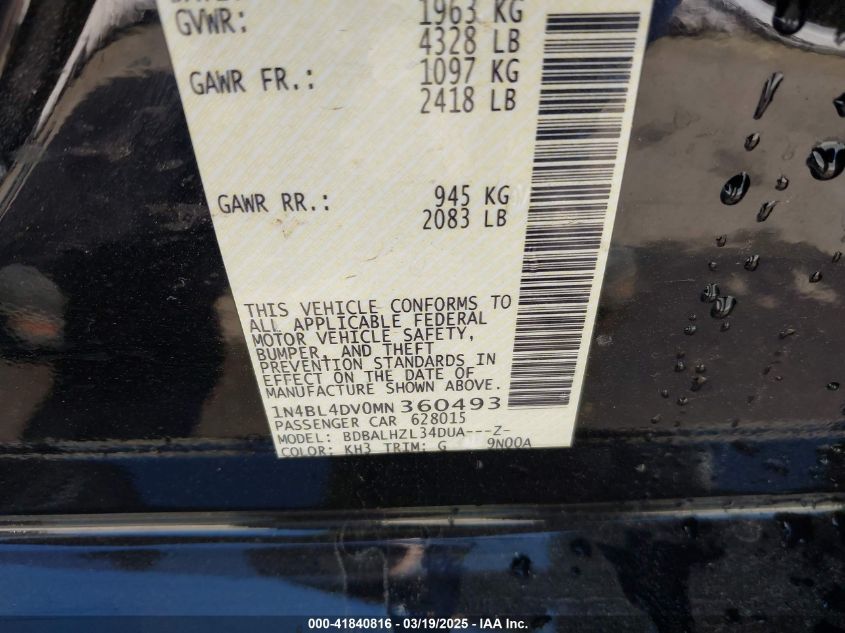 Color BlackCylinders 4Drive Front wheel driveVIN 1N4BL4DV0MN******State Run & Drive VerifiedDamage Back AutoRIA