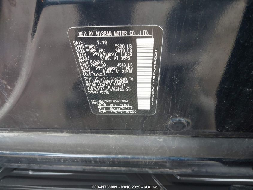 2017 NISSAN ARMADA 2017 Gasoline, 5.6, Unknown, VIN - JN8AY2ND4H9****** from the USA