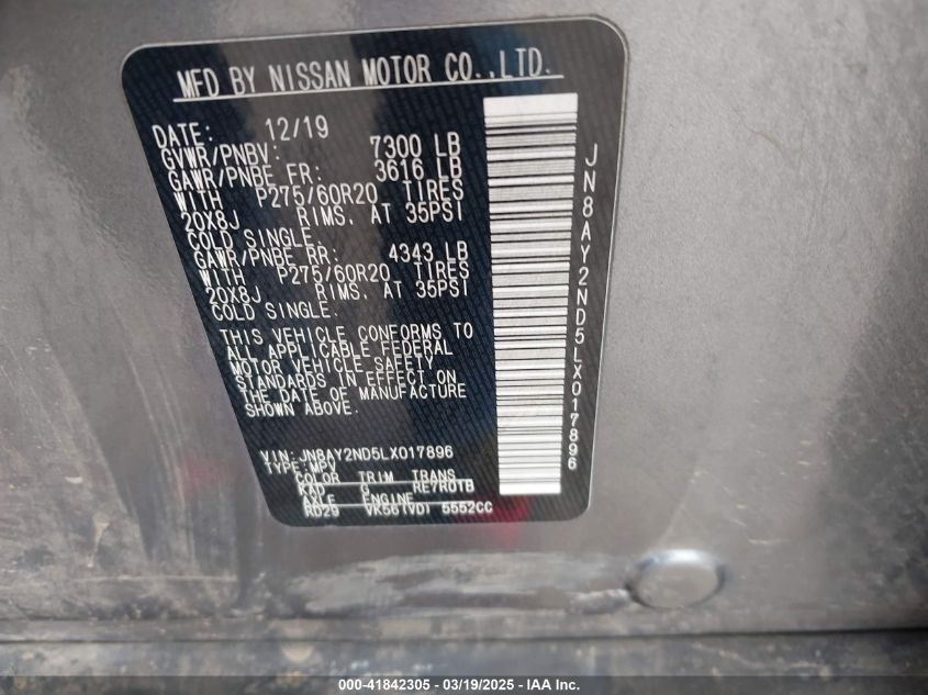 2020 NISSAN ARMADA 2020 Gasoline, 5.6, Unknown, VIN - JN8AY2ND5LX****** from the USA