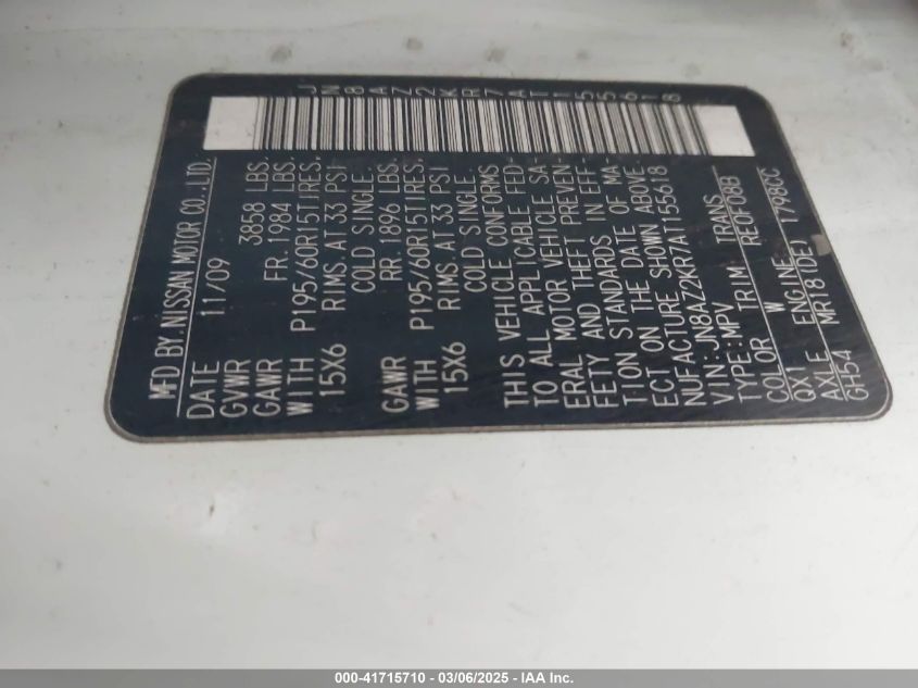 Color WhiteCylinders 4Drive Front wheel driveVIN JN8AZ2KR7AT******State Run & Drive VerifiedDamage Rear rightAuction date 2025-03-25 AutoRIA