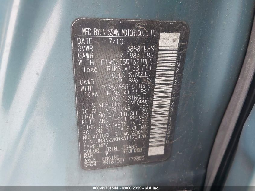 2010 NISSAN CUBE 2010 Gasoline, 1.8, Front wheel drive, VIN - JN8AZ2KRXAT****** from the USA