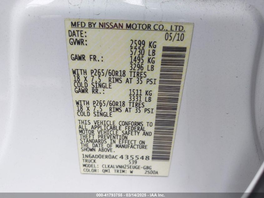 Color WhiteCylinders 6Drive UnknownVIN 1N6AD0ER0AC******State Run & Drive VerifiedDamage Front or backAuction date 2025-03-26