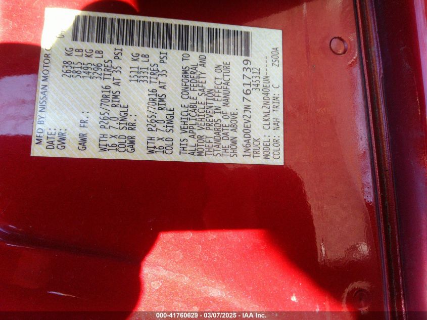 Color RedCylinders 6Drive Full driveVIN 1N6AD0EV2JN******State Run & Drive VerifiedDamage Left sideAuction date 2025-03-24 AutoRIA