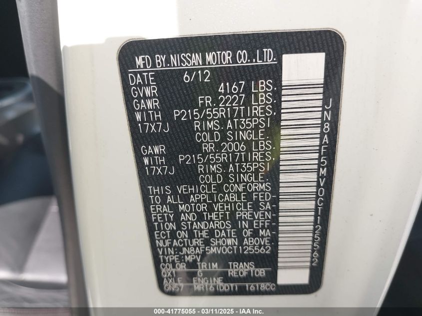 Color WhiteCylinders 4Drive Full driveVIN JN8AF5MV0CT******State Run & Drive VerifiedDamage Front or back AutoRIA