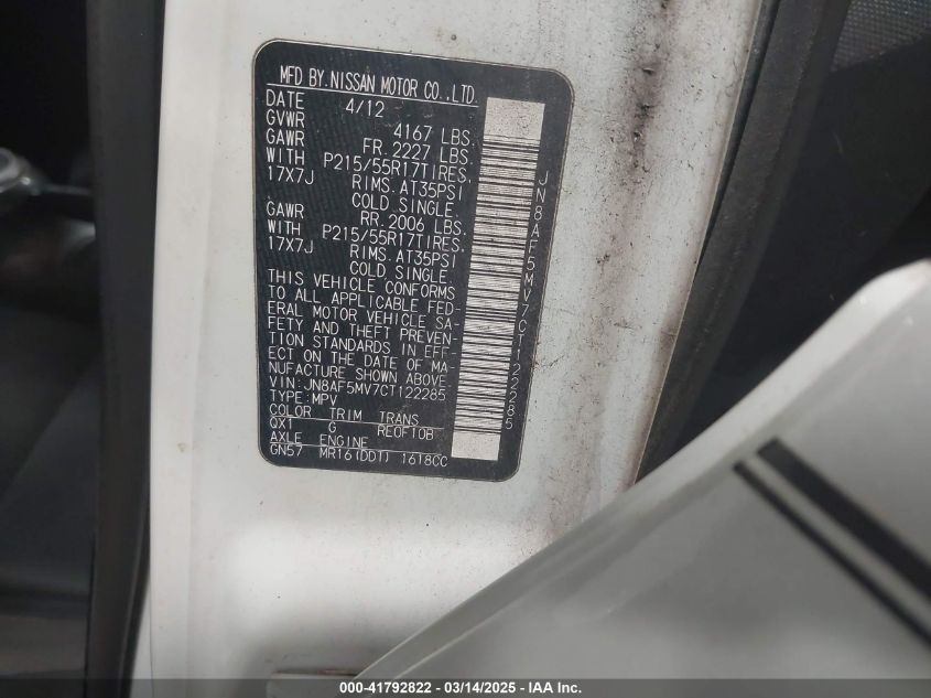 Color WhiteCylinders 4Drive Full driveVIN JN8AF5MV7CT******State Run & Drive VerifiedDamage Insignificant AutoRIA