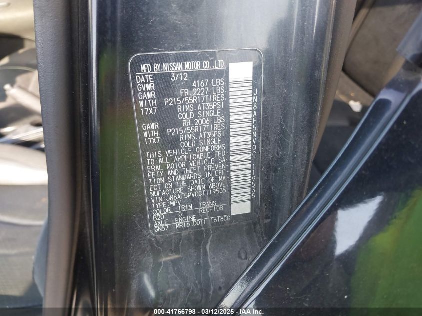 Color BlackCylinders 4Drive Full driveVIN JN8AF5MV0CT******State Run & Drive VerifiedDamage Rear left AutoRIA