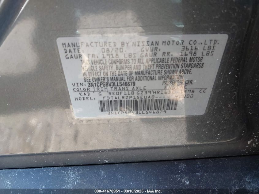 Color GrayCylinders 4Drive Front wheel driveVIN 3N1CP5BV3LL******State Run & Drive VerifiedDamage Front or back AutoRIA