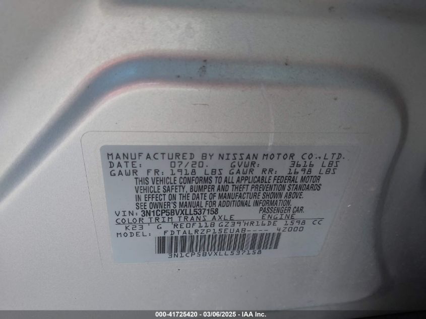 Color SilverCylinders 4Drive Front wheel driveVIN 3N1CP5BVXLL******State Run & Drive VerifiedDamage Rear right AutoRIA