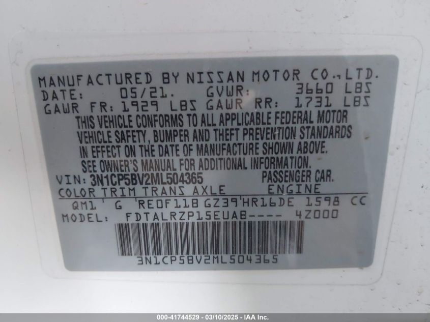 2021 NISSAN KICKS 2021 Gasoline, 1.6, Front wheel drive, VIN - 3N1CP5BV2ML****** from the USA