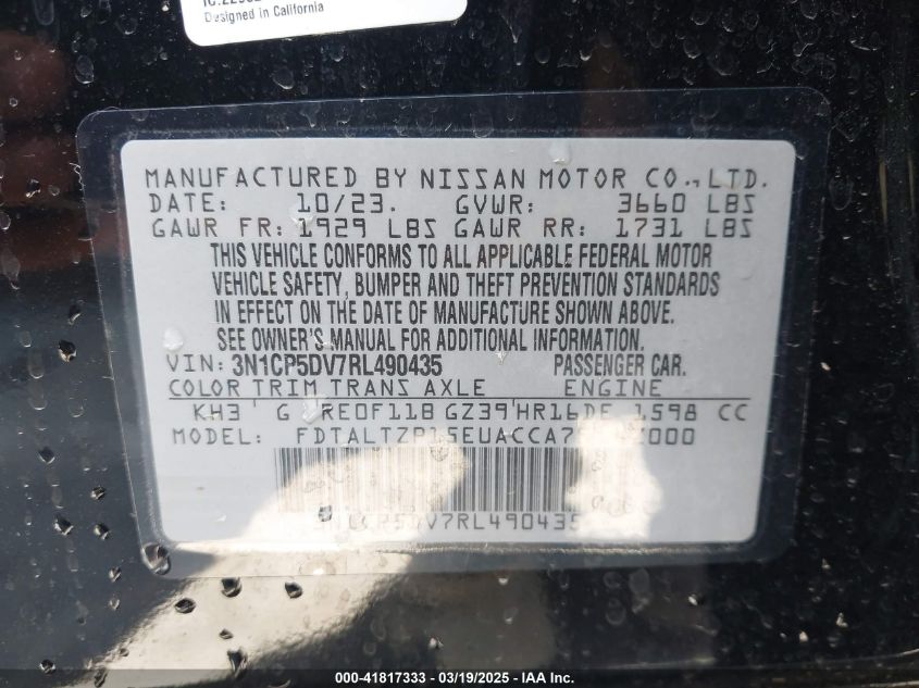 Color BlackCylinders 4Drive Front wheel driveVIN 3N1CP5DV7RL******State Run & Drive VerifiedDamage Front left