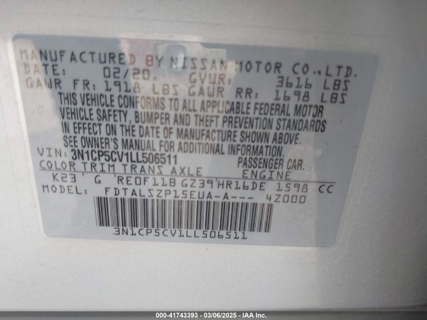 2020 NISSAN KICKS 2020 Gasoline, 1.6, Front wheel drive, VIN - 3N1CP5CV1LL****** from the USA