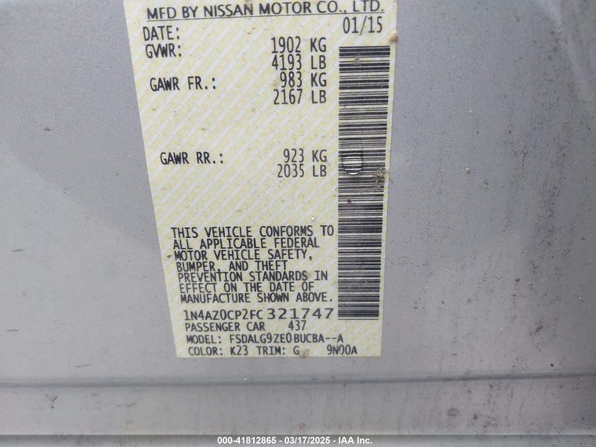 Color SilverDrive Front wheel driveVIN 1N4AZ0CP2FC******State Run & Drive VerifiedDamage InsignificantAuction date 2025-03-24 AutoRIA